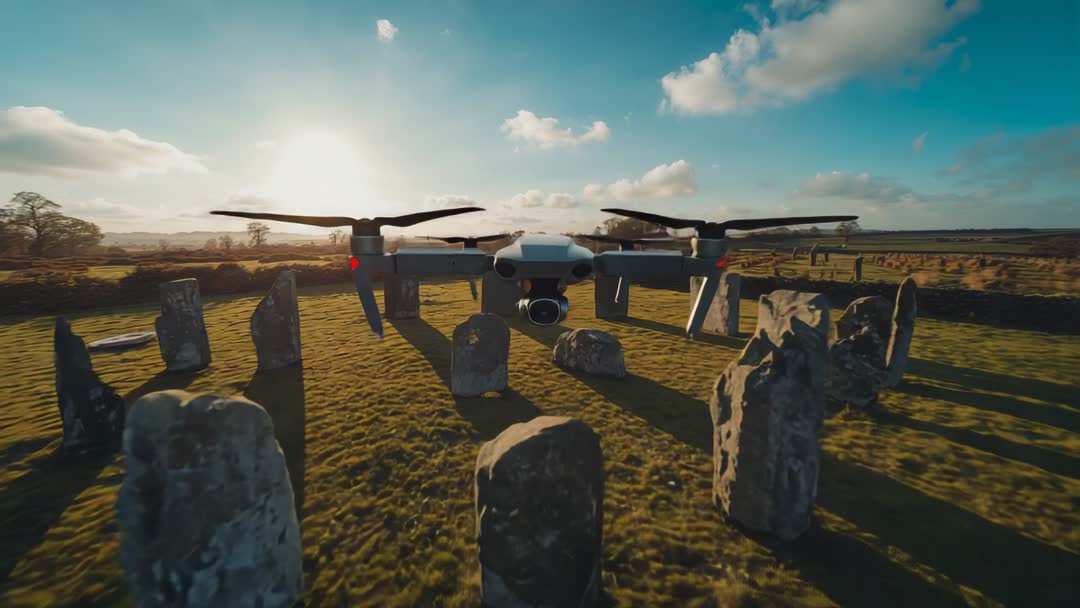 AI Generated Image. Video clip showing low-angle quadcopter drone launching from ancient stone circle during golden hour, red LEDs activating and camera gimbal recording grassy ring. Warm backlight producing long dramatic shadows and rim lighting on weathered stones. Scene juxtaposing high-tech UAV with megalithic heritage, conveying mystery, exploration, and innovation. Ideal for technology documentary openings, archaeology features, tourism promotions, drone product marketing, website hero banners, social media ads, and broadcast promos. Editing suggestions including slow-motion reveal, drone POV cutaway, wide aerial pullback, color grading for warm cinematic tones, and ambient soundtrack for atmospheric mood.