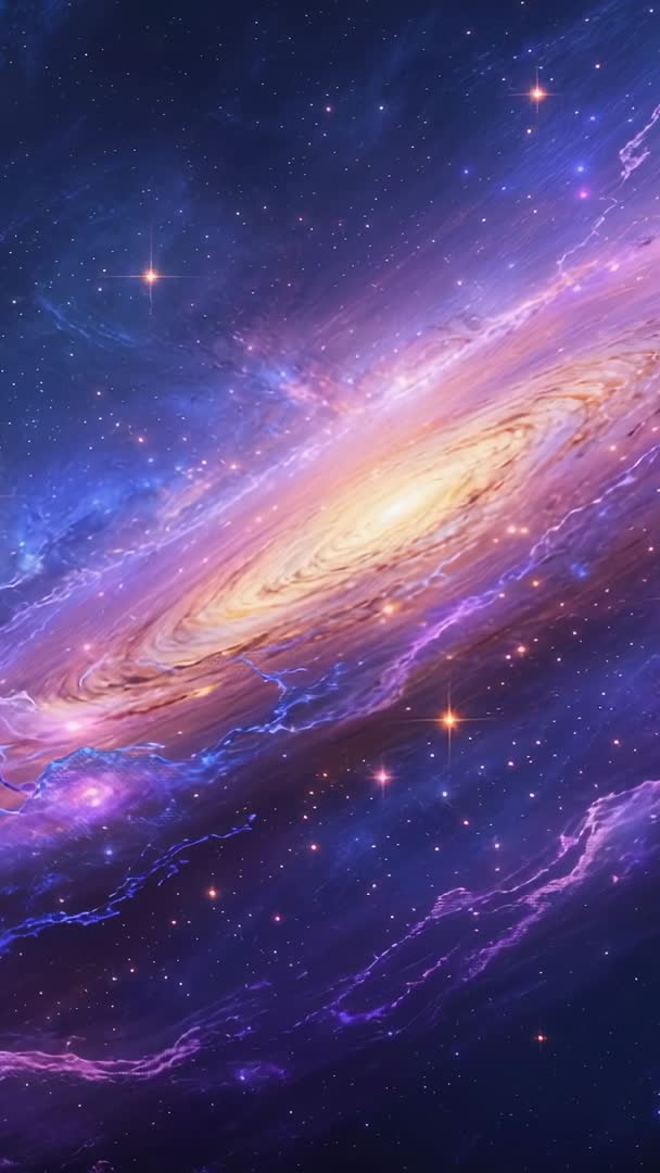 AI Generated Image. Vertical 9:16 video showing space telescope launching and streaming vibrant spiral galaxy core with luminous dust arms, electric nebula filaments, and scattered starfield. Colors featuring purple, blue, gold creating cinematic contrast and deep sense of scale. Camera movement suggesting slow reveal and gentle zoom toward glowing core, providing dynamic intro for science videos. Use for social media stories, mobile wallpapers, app intros, streaming channel backgrounds, documentary openers, planetarium visuals, educational explainers, and sci-fi trailers. Editable color grading and overlaying text recommended for title cards and lower thirds. Licensing suitable for broadcast, digital campaigns, presentation use. Keywords included for search optimization and content tagging.