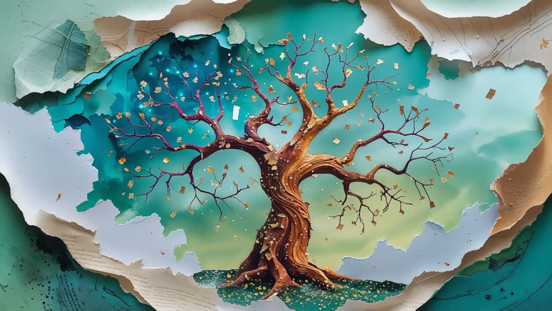 AI Generated Video. This video showcases a multi-layered paper art collage depicting a stylized tree with a canopy of golden leaves against a rippling turquoise sky. The paper layers are torn stylishly to create a jagged frame, adding an artistic dimension suitable for craft presentations, showcasing creativity in design, and promoting paper art exhibitions with themes of nature and irony. Ideal for use in advertising artistic workshops, promoting gallery exhibitions, or enhancing digital blogs on eco-friendly art and luck strategies.