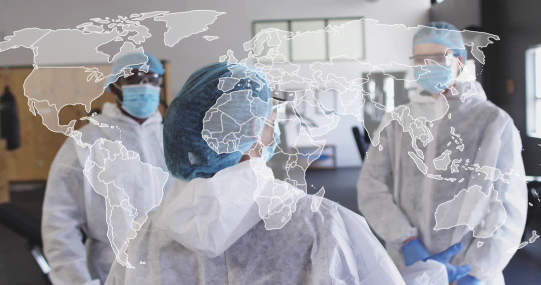 Depicting medical team wearing full PPE and conducting briefing while world map overlay highlighting global response coordination. Scene featuring coveralls, surgical masks, gloves, hair covers, and safety goggles, emphasizing infection control and emergency preparedness. Camera focusing on team lead communicating plan with teammates, creating sense of leadership and collaboration. Graphic overlay of world map adding context of international outbreak management and cross-border coordination. Use for news segments, training modules, public health campaigns, government briefings, corporate crisis communications, website hero banners, social media awareness posts, editorial illustrations, and stock video libraries. Suggest cropping for close-up on team lead for leadership messaging, or using wide crop for teamwork and operational scale. Recommend pairing with captions about preparedness, global health, or emergency response. Conveying urgent, professional, collaborative tone suitable for topics like pandemic response, disaster relief, international aid, and healthcare logistics.