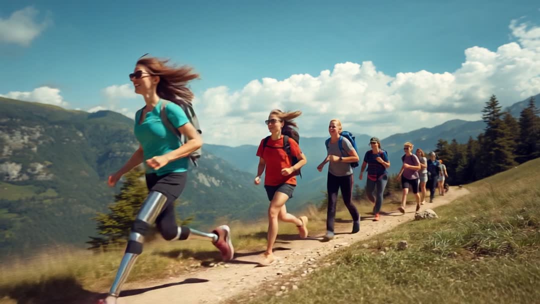 AI Generated Image. Showing woman leading hiking group while running with prosthetic leg along sunlit alpine trail. Featuring sweeping mountain ridges, meadow edges, pine forest and dramatic cloudscape. Capturing motion with wind-blown hair, dynamic stride and smiling group members following on trail. Useful for promoting adaptive sports, prosthetics technology, inclusive outdoor programs, adventure tourism, fitness campaigns and inspirational storytelling. Editing suggestions: using drone follow-shot for cinematic reveal, slow-motion for emphasizing prosthetic motion, cutaways to backpacks and trail details for context. Color grading recommendation: warm tones for uplifting mood or cooler teal-orange for dramatic commercial look.