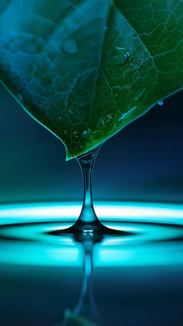 AI Generated Image. Video showing water droplet forming on pointed leaf tip, stretching then falling into teal pool and creating concentric ripples and mirror reflection. Macro vertical format featuring fine leaf vein texture, surface tension dynamics and shallow depth of field for cinematic look. Footage working well for environmental campaigns, hydration and skincare product ads, spa and wellness branding, science explainers about surface tension, social media reels, smartphone backgrounds and meditation loops. Editing suggestions including looping slow motion segment, color grading toward teal and green palette, overlaying logo in upper third and adding soft ambient water sound for calming effect. Technical notes mentioning macro lens, high-speed capture, vertical 9:16 aspect ratio, clean studio lighting and ready-to-use stock footage.
