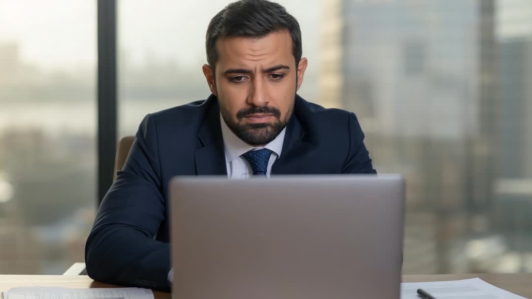 AI Generated Image. Footage showing executive leaning over laptop while reviewing detailed reports and printed documents at desk in modern office with blurred city skyline visible through large windows. Showing furrowed brow and focused expression, conveying concentration, critical thinking, or concern during financial review or project analysis. Wearing business suit and tie with pen and paperwork on desk for added context. Composition offering close medium shot ideal for cutaway, B-roll, or talking-head transitions. Suggested uses include corporate video intros, financial analysis explainers, business blog headers, leadership presentations, training modules, HR or consulting marketing, productivity and workplace stress articles, social media ads targeting professionals, and news segments about corporate decision making. Suitable for overlaying text, lower thirds, or voiceover narration.