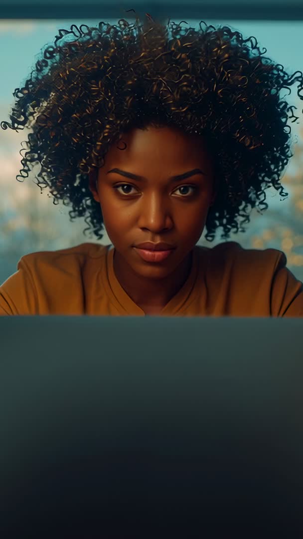 AI Generated Image. This vertical video showing young woman leaning forward and typing on laptop in home office with window view and warm natural light. Tight close-up framing placing laptop in foreground and face centered, capturing focused expression and subtle screen reflections. Footage featuring moments of reading, typing, pausing to think, and engaging in video call, offering versatile cuts for storytelling. Ideal for mobile-first content such as social media reels, stories, TikTok, LinkedIn vertical ads, plus website hero banners, SaaS landing pages, e-learning promotions, HR recruitment, and productivity blog headers. Editing suggestions: apply warm color grade, add subtitles and lower third, include subtle ambient soundtrack, crop for 9:16 mobile format, overlay call-to-action for conversion campaigns. Usage ideas: background for remote work articles, thumbnail for online courses, intro clip for virtual meetings, B-roll for corporate videos, promotional creative for tech products. Mood conveying focus, professionalism, and contemporary lifestyle.