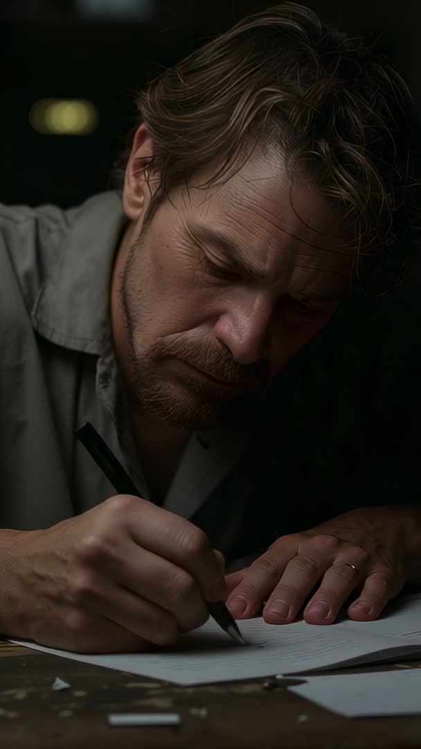 AI Generated Image. Closeup vertical video showing leaning man with rolled sleeves holding black pen and refining sketch on paper at desk. Low-key lighting highlighting facial expression, hand movements, paper texture and pen strokes, creating mood of quiet concentration and precision. Tight framing around face and hands producing intimate behind-the-scenes view of creative process and craftsmanship. Footage fitting use as B-roll for design tutorials, architecture presentations, art and craft promotions, creator profile reels, and social media vertical ads focused on focus and productivity. Color palette leaning warm with deep shadows, enabling overlaying of titles and captions while preserving cinematic look. Pairing with soft ambient music and adding captions for mobile-first campaigns, or cutting into longer documentaries and brand films about craftsmanship, maker stories, and studio life.
