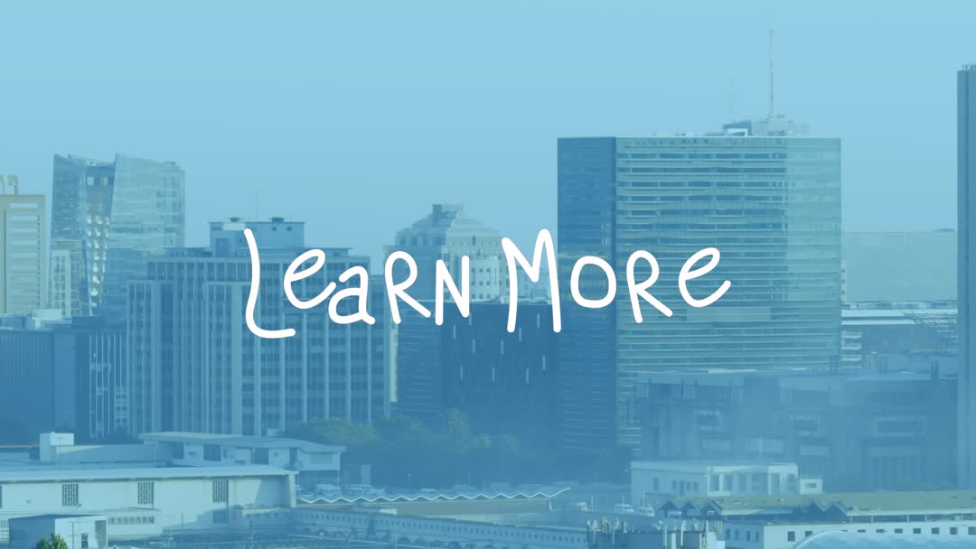 Learn More Overlaid on Vibrant Blue Cityscape Background Video