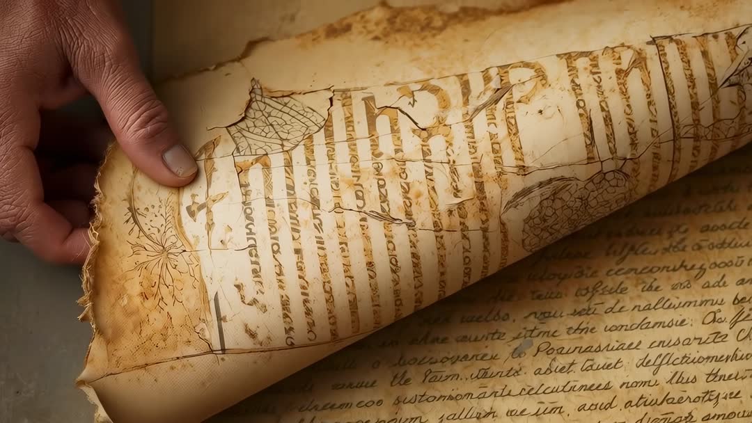 AI Generated Image. Video clip showing left hand lifting aged parchment scroll, revealing singed edges, browned paper, and flowing calligraphy. Close-up framing highlighting texture, burn marks, ink lines, and decorative borders. Footage evoking historical research, archival discovery, antiquarian restoration, and storytelling. Ideal for book trailer intros, documentary sequences about manuscripts, museum exhibit loops, educational lectures on paleography, marketing for conservation services, and background for mystery or period drama projects. Clip adapting well to sepia grading, slow pan, title overlays, and cutaway to macro details. License for editorial, commercial, and educational use.