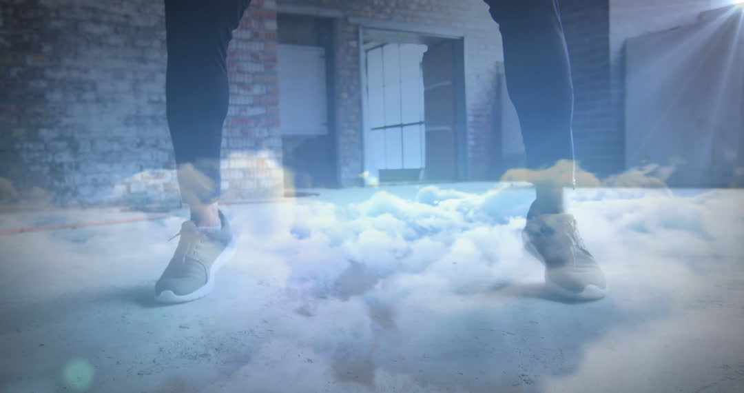 - Legs of Athlete Training in Gym with Cloud Overlay