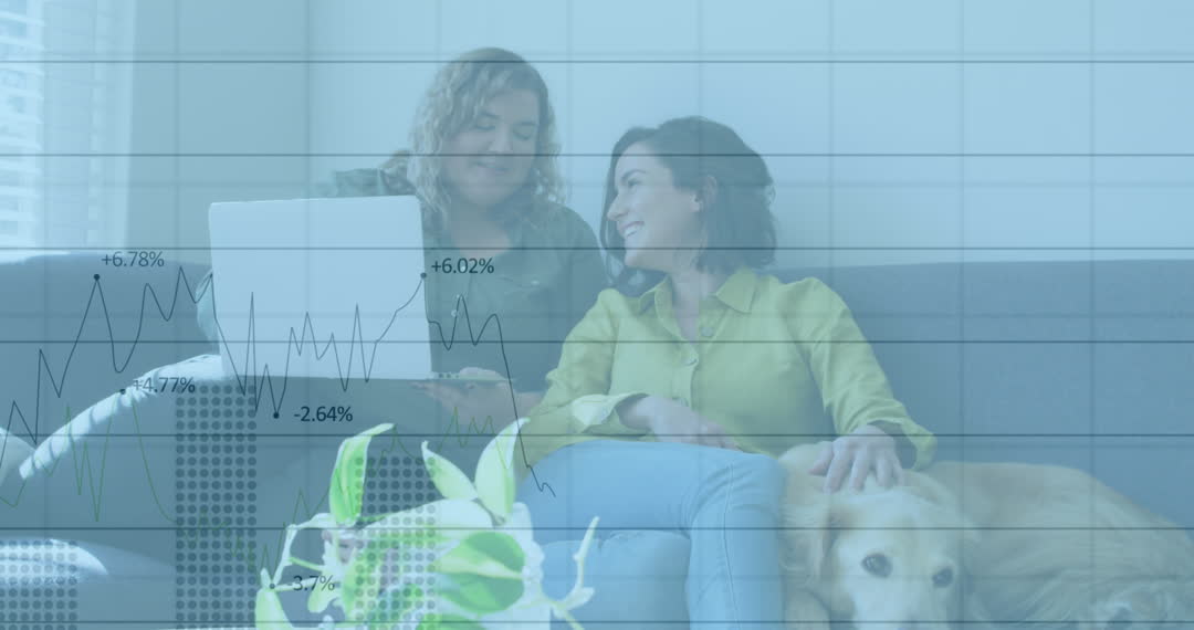 Lesbian Couple Using Laptop with Financial Data Overlay Video