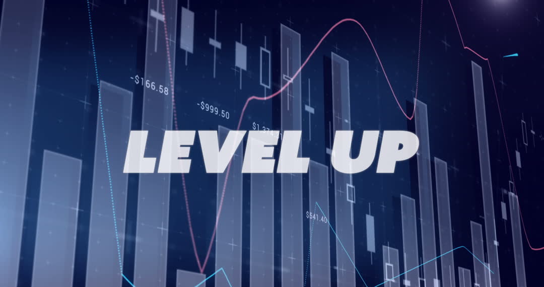 This digital illustration features the phrase 'Level Up' prominently displayed over financial and statistical bar graphs. The background is blue, adding a technological and modern vibe. Suitable for use in business presentations, financial technology materials, gaming industry visuals, and marketing to convey progress, growth, or evolution within a digital context.