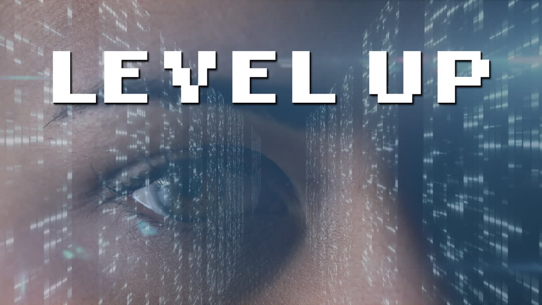 Close-up of an eye overlaid with digital visuals and bold pixelated text 'Level Up', suggesting progress or enhancement. Ideal for representing advancement in technology, game design analogies, self-improvement themes, or futuristic presentations.