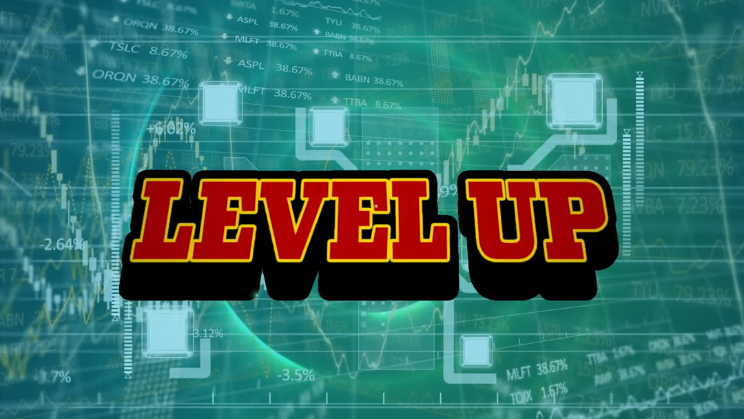 Animation features 'Level Up' text overlaid on financial data and circuit symbols. This design represents themes of progress, innovation, and the intersection of technology and finance. Suitable for advertisements, presentations, and materials illustrating advancements in business or financial technology innovations.
