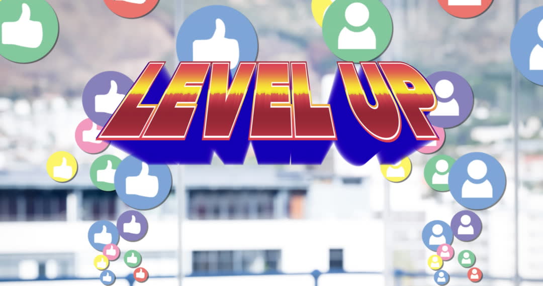 This vibrant graphic shows 'Level Up' text overlaid with iconic social media reaction symbols, set against a blurred cityscape, ideal for conveying concepts of digital marketing, boosting online presence, group dynamics, and gamifying social media interactions. Suitable for presentations, social media campaigns, and entertainment-themed promotions.