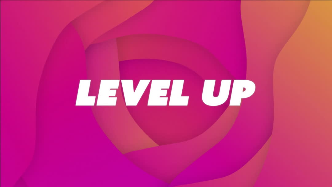 Dynamic animation features bold text that states 'Level Up' over swirling abstract pink and orange shapes. Concept evokes progress, gaming advancement, or successful achievement themes. Useful for social media posts about technology, evolving skills, or motivational content aimed at encouraging improvement and personal growth.