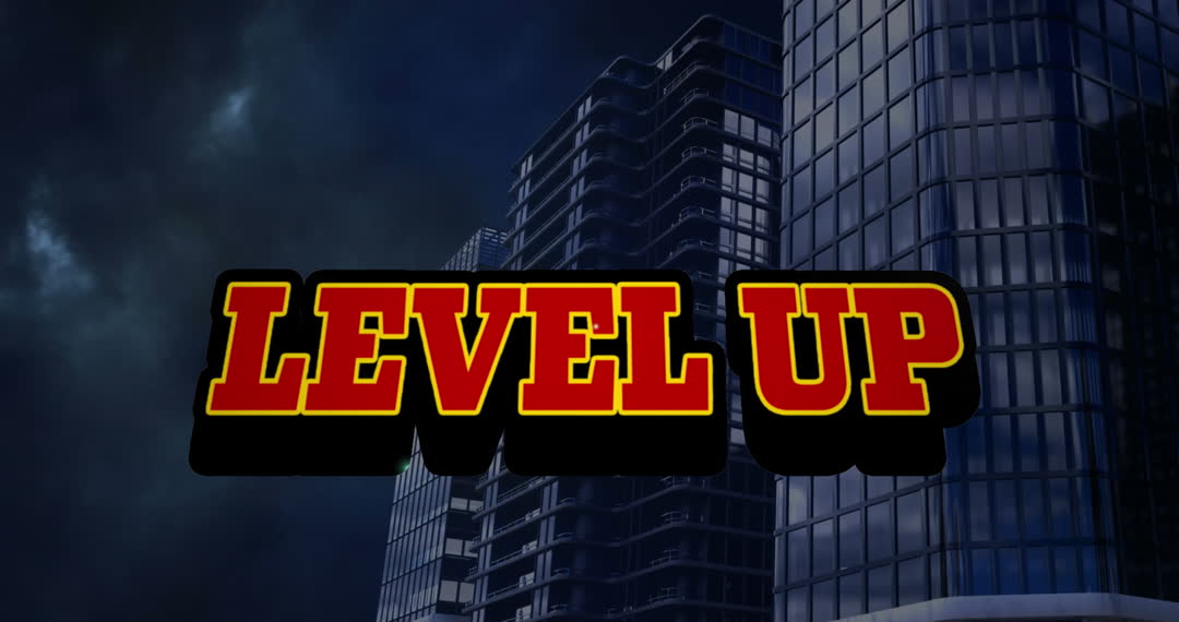 This visual displays 'Level Up' prominently over a modern urban skyline, blending the progress theme with a technological essence. Suitable for usage in digital marketing for tech products, motivational content, gaming interfaces, or blogging about career advancements and urban development. The cityscape emphasizes modernity and growth.