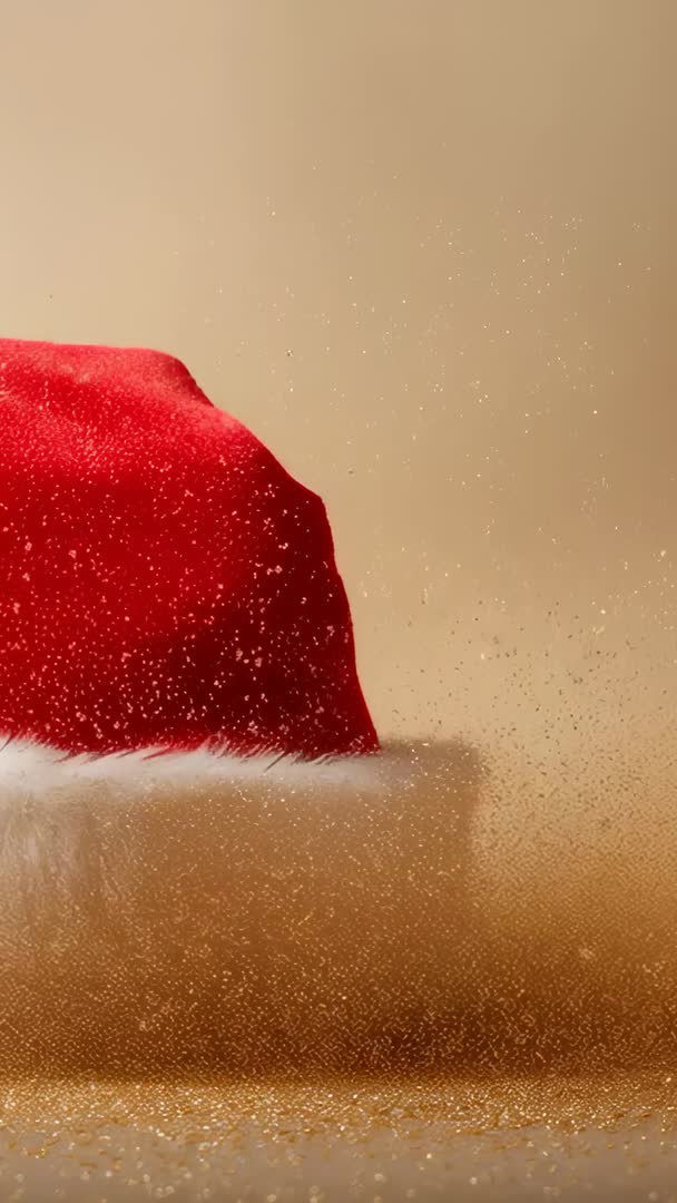 AI Generated Video. Vertical loop showing red velvet Santa hat emerging from rising gold particles and sparkling dust. Close-up capture highlighting plush fur trim and soft pompom catching warm light and creating luxurious festive mood. Serving as attention-grabbing intro for social media reels, vertical ads, holiday greeting clips, seasonal product reveals, and website hero loops. Advising overlaying bold text or logo in upper empty space while preserving shimmering foreground for depth. Color palette combining rich red and warm metallic gold, matching luxury branding, gift guide visuals, event promos, and New Year celebration campaigns. Delivering gentle particle motion, shallow depth of field, and soft bokeh for elegant, cinematic holiday feel. Clip looping and trimming friendly for beat-synced edits and short-form vertical storytelling.