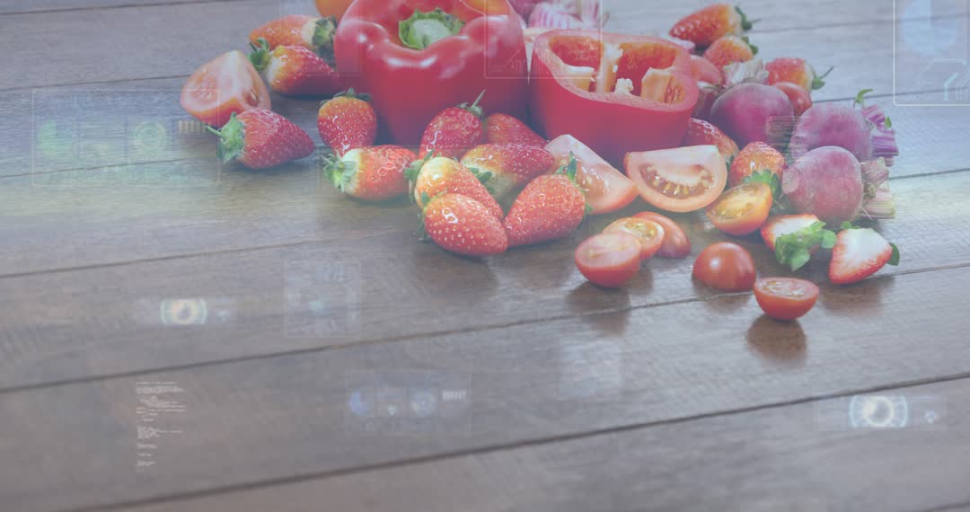 Video showing close-up of fresh strawberries, halved cherry tomatoes, red bell pepper, plums and sliced tomatoes scattered on rustic wood tabletop while off-frame light casting shifting rectangular reflections across surface. Camera holding steady with shallow depth of field, highlighting texture of fruit skin and wood grain, lens flare and soft reflections adding cinematic mood. Color palette featuring warm reds and natural browns, glossy fruit surfaces contrasting with matte wood planks. Use for recipe intros, farm-to-table promotions, healthy eating campaigns, grocery and market ads, restaurant menu videos, cooking tutorials, social media banners and product packaging. Editing suggestions: try slow zoom or subtle pan, color grade for warm tones, add soft ambient music for mood, overlay text for recipe names, pricing or call-to-action elements.
