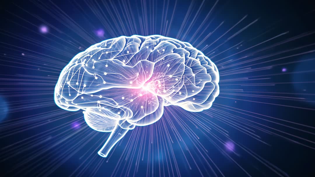 AI Generated Image. The video showcases a digital representation of a glowing brain, with light streaks radiating in a futuristic, AI-driven atmosphere. Ideal for illustrating concepts of technology, artificial intelligence, and advancements in neurological research. Useful for tech presentations, website backgrounds on AI topics, or educational media exploring innovations and abstract truth concepts.
