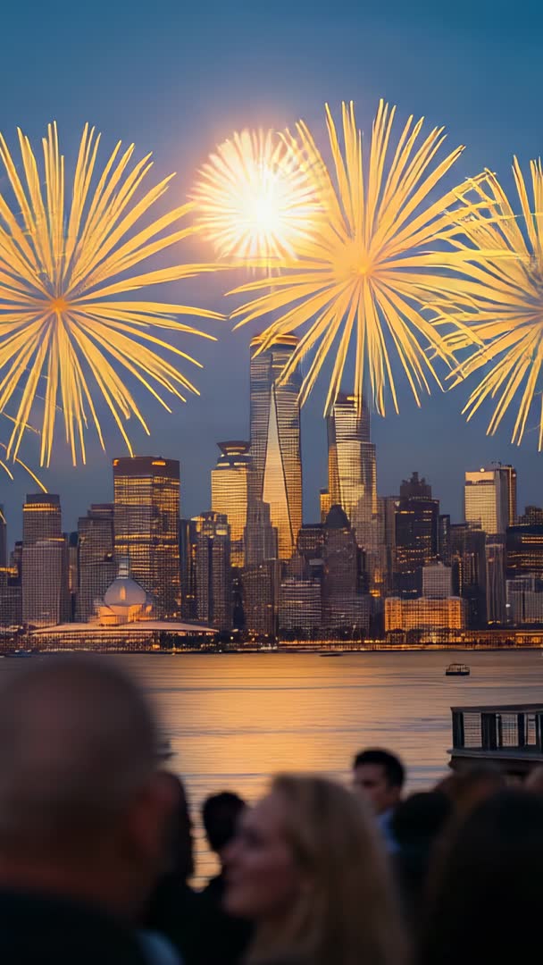 AI Generated Video. Showing golden fireworks bursting over urban waterfront skyline at dusk, vertical video captures dramatic reflections on water and silhouette of spectators in jackets. Framing emphasizes tall spire and surrounding towers while crowd foreground adds scale and atmosphere. Boat passing across frame adds dynamic movement and compositional interest. Use for event promotion for holidays, city festivals, waterfront concerts, fireworks shows. Use for social media reels and vertical ads for tourism boards or travel companies. Use for broadcast openers, countdown sequences, or news segments highlighting celebrations. Use for website hero banners, backgrounds for seasonal campaigns, or cinematic intros for YouTube. Use for stock footage packs for editors seeking dramatic urban night scenes. Editing tips: crop or trim for short-form vertical content and add cinematic music or thumping percussion. Apply slight slow motion or motion blur to accentuate fireworks trails. Balance highlights to preserve glow of fireworks while retaining building details.