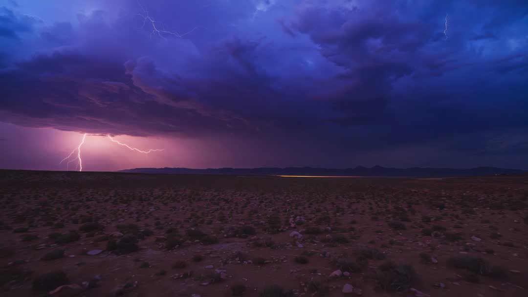 AI Generated Image. Video clip showing lightning striking desert plain beneath heavy storm cloud bank, casting pink and purple glow across horizon. Footage capturing dramatic thunderstorm over arid landscape, revealing distant mountain ridge silhouette and faint headlight streak on highway. Ideal for weather report, news broadcast, documentary, cinematic trailer, social media background, website hero banner, environmental campaign, travel promotion, or storm safety PSA. Useful as stock clip for meteorology presentations, TV production, online ads, or ambient background for music videos. Colour grading and subtle sound design recommended to enhance tension and scale. Wide-angle composition offering negative space for on-screen titles and lower-third graphics. Frame showing high contrast between illuminated storm core and deep blue cloud canopy, delivering dramatic mood and cinematic atmosphere.