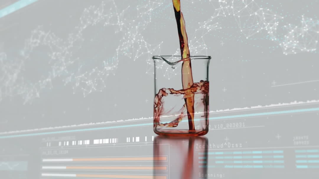 A visually striking video depicting liquid pouring into a beaker with a digital DNA strand in the background. This conveys a fusion of biology and technology. Ideal for illustrating scientific articles, biotech innovations, or educational materials about data science and genetics.