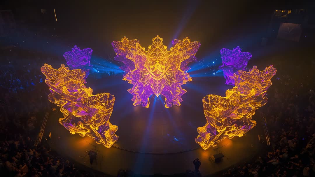 AI Generated Video. Video showing live concert stage with five pulsing holographic formations shifting from purple into orange, framed by dramatic blue beam lights and packed audience. Footage highlighting dynamic projection mapping, LED visuals, and generative geometry, blending live production with creative visual design. Colors and motion delivering energetic, psychedelic, futuristic mood, fitting EDM, pop, synthwave, and tech brand content. Serving festival promos, concert trailers, VJ loops, event openers, broadcast bumpers, social media teasers, and editorial stories about live production and immersive art. Clip working well as background visual for websites, streaming channels, exhibition projections, and corporate AV showcases wanting bold, high-energy atmosphere.