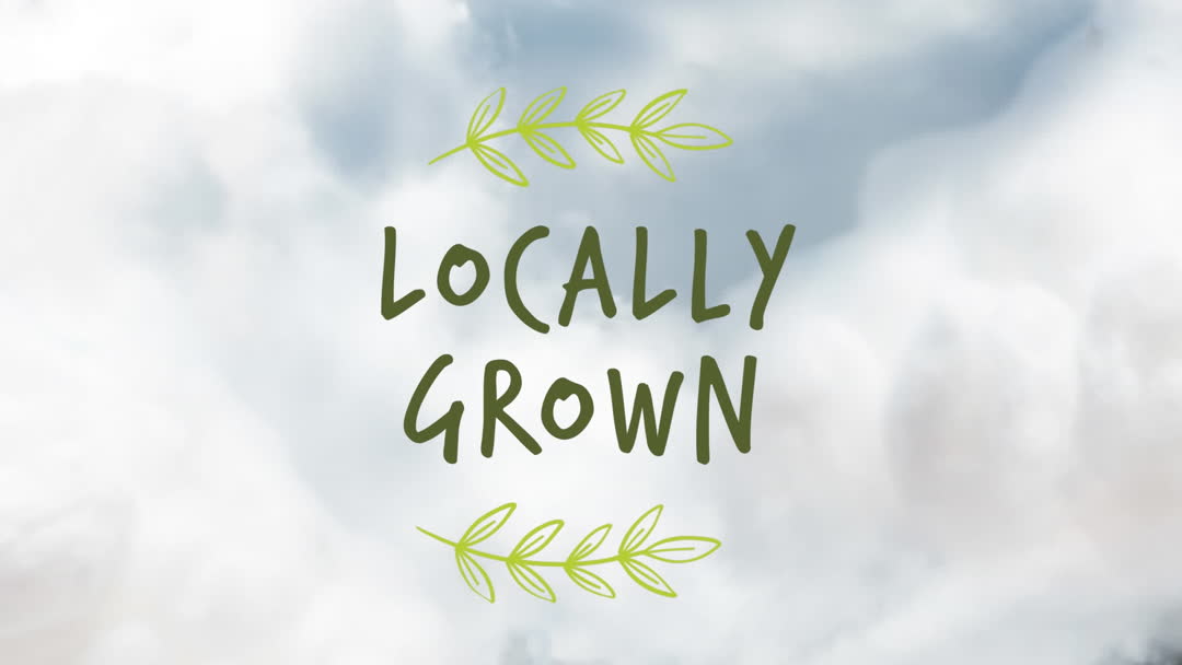 Design showcases 'Locally Grown' with leaves motif against cloudy sky. Ideal for promoting sustainable products, farm branding, eco-friendly campaigns, and organic market materials. Inspires environmental consciousness and fresh, healthy living.