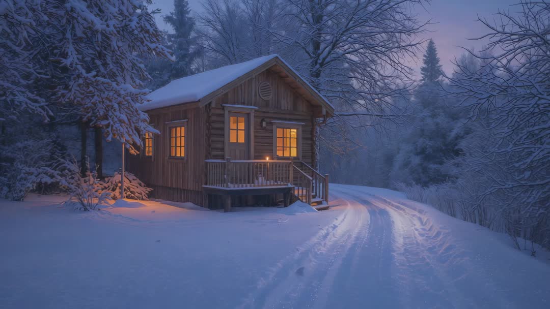 - Log cabin glowing at dusk beside snow-covered forest road, lantern casting warm amber light