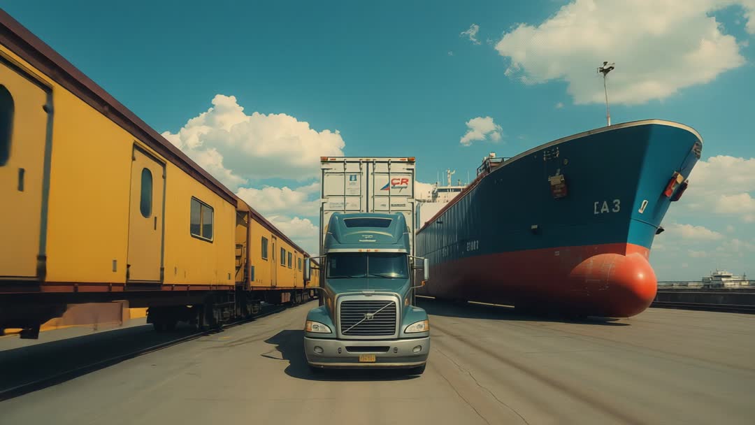 AI Generated Image. This video captures an active transportation and logistics scene featuring a semi-truck moving past a train and a large container ship in a bustling port area. It reflects the synchronized operations involved in global shipping and distribution. This content is ideal for illustrating articles and projects that focus on freight transportation, logistics strategies, and the roles of different transport modes in universal supply chain networks.