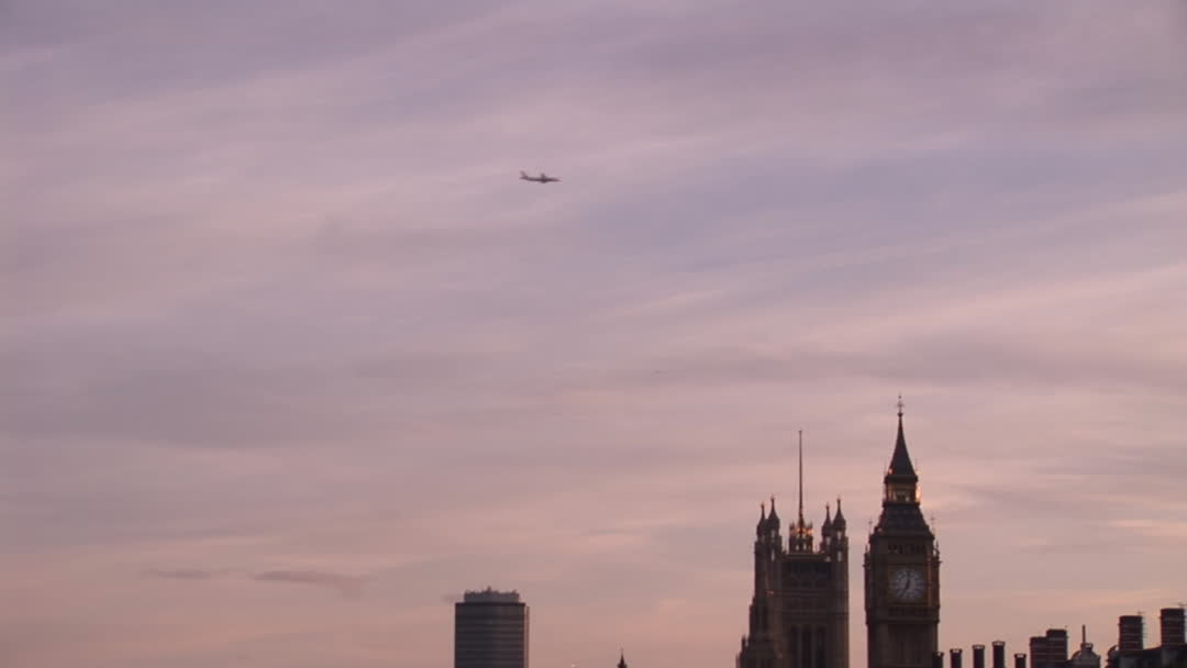 London Skyline at Dusk Featuring Big Ben and Airplane Video