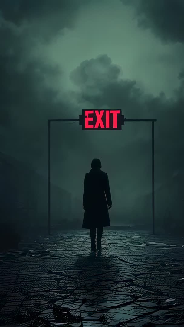 AI Generated Video. Vertical cinematic clip showing lone silhouette walking toward glowing EXIT sign over cracked pavement under stormy sky. Conveying suspenseful, ominous mood and strong visual contrast between neon red sign and teal-green shadows. Working well for thriller trailers, horror intros, dystopian storytelling, escape and survival themes. Suggested uses include opening scene for short film, title card background, social vertical ad, Instagram Reel or TikTok clip, trailer teaser, game teaser, and book cover concept for dark fiction. Editing ideas include pairing with sparse piano or cinematic synth, adding slow push-in or pull-out, using overlay text for call to action or chapter title, and looping short segment for ambient background. Color grading tips include boosting red channel for EXIT sign, cooling shadows toward green-blue, and increasing contrast to emphasize silhouette. Targeting filmmakers, game developers, publishers, music artists, and creative agencies seeking moody, mysterious visual for marketing or storytelling.