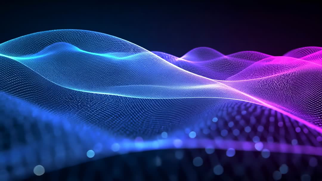 AI Generated Image. Loopable neon wireframe waves flowing across dark void, shifting between blue and purple magenta hues and punctuated by soft bokeh particles. Visual style conveying futuristic technology, data flow, and virtual networks while maintaining cinematic depth and smooth motion. Ideal for tech conference openings, background for product launch promos, corporate presentations on AI and big data, music visualizers, social media loops, and VJ sets. Motion-friendly composition leaving negative space for logo or title overlays and suited for lower third animations and transitions. Color palette working well with white or neon text and adaptable for branding. Useful for website hero banners, app backgrounds, promotional reels, educational content on signal processing, and immersive event projection. Render-ready for high-resolution playback and seamless looping.