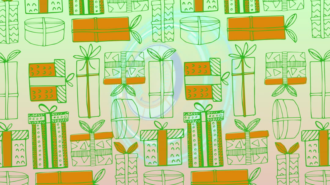 This animation showcases a seamless repeating pattern of illustrated gift boxes in various sizes and shapes, set against a calming green backdrop. The central element is a digitally generated swirling processing circle icon which adds a technological touch. This design is perfect for presentations or graphics related to online shopping, e-commerce, or festive technological solutions, providing a creative and visually appealing framing concept.