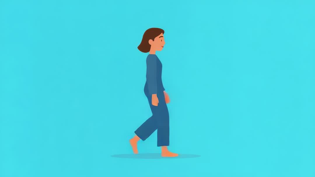 AI Generated Image. Showing woman in side profile walking barefoot across solid turquoise backdrop, featuring subtle oval shadow for grounding. Offering smooth walking loop ideal for seamless playback in UI elements, loading screens, hero banners, and social media posts. Providing flat 2D vector look with simple color palette for easy brand integration and quick color swaps. Supporting customization of speed and pose for pacing control and rhythmic matching. Including transparent background option and clean shadow for straightforward compositing and thumbnail creation. Serving onboarding flows, wellness and lifestyle apps, explainer sequences, animated icons, and training or demo videos.