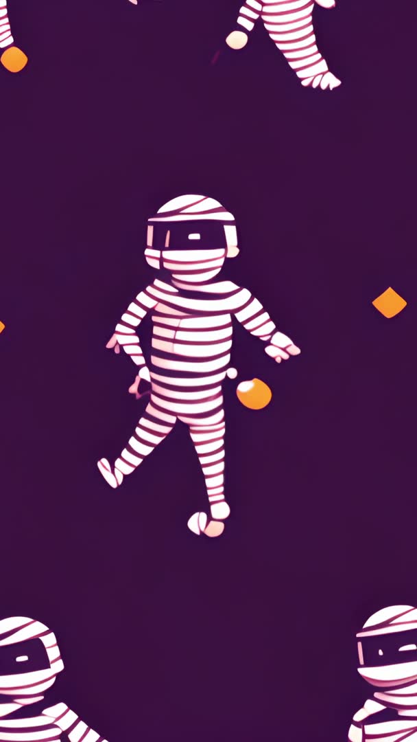 AI Generated Image. Looping vertical animation featuring bandaged mummy character stepping in place over deep purple backdrop with scattered orange diamond shapes. Minimalist flat design and bold color contrast creating whimsical, surreal vibe suitable for playful or spooky projects. Working well for social media stories and reels, vertical ads, mobile wallpapers, app backgrounds, animated banners, and Halloween campaigns. Looping seamless motion making smooth background or attention-grabbing animated element in promotional clips and UX prototypes. Delivering playful tone ideal for children content, party invites, game UI, and short-form vertical videos. Plenty of negative space around central figure for headline or logo overlay and easy text placement.