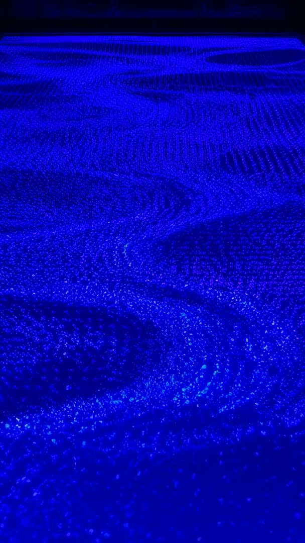 AI Generated Video. Showing close-up of moving blue LED dots forming rippling waves across floor grid in vertical video loop. Creating abstract motion via dense pixel field and subtle depth cues, producing hypnotic wave patterns and luminous texture. Serving as looping background for vertical formats, supporting tech product launches, social media stories, digital signage, concert backdrops, and immersive gallery installations. Recommending pairing with slow electronic ambient soundtrack, applying color grading to boost contrast, and using gentle speed ramping for cinematic effect. Providing high-impact visual for futuristic branding, UI demos, science fiction scenes, meditation, and relaxation visuals.