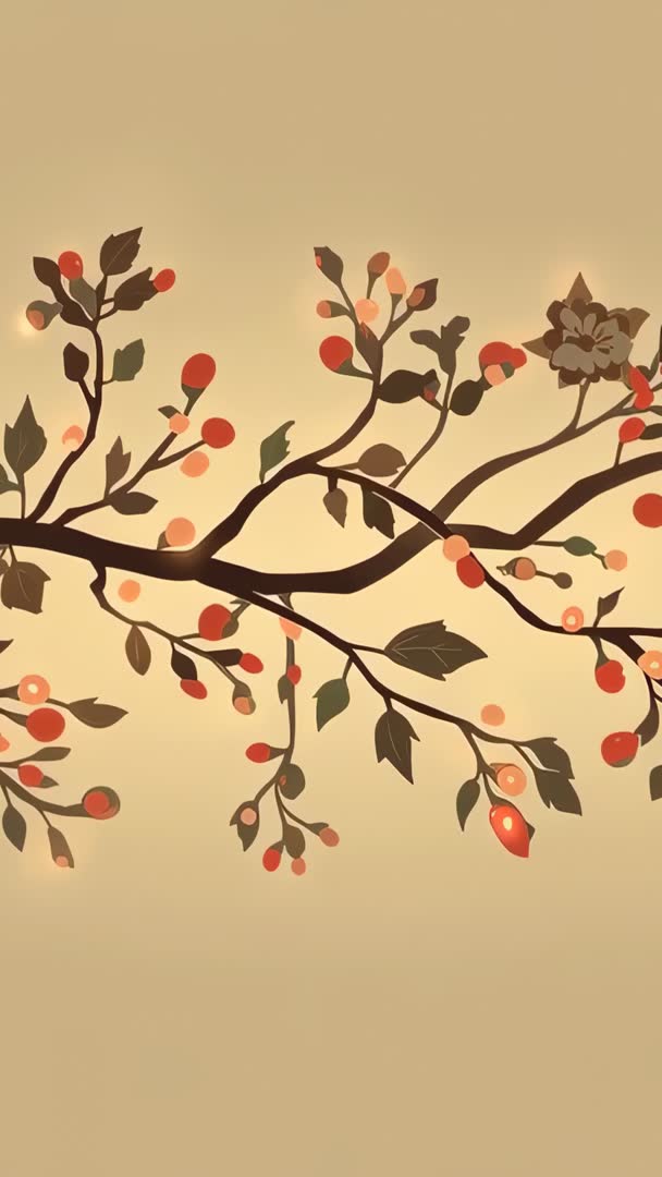 AI Generated Video. Looping vertical video showing stylized botanical branch swaying gently across warm beige gradient while berries pulse with soft glow. Design featuring dark brown stems, olive leaves, red and peach berries, subtle bloom highlights and smooth parallax motion. Working well for social media stories, mobile wallpapers, website headers, digital signage, event backdrops, product packaging mockups, seasonal promotions, wedding motion invites and ambient lounge displays. Editing notes: loop seamless at cut point, adjust speed for calmer or livelier rhythm, overlay text or logo on lower empty area for branding, crop to 9:16 for vertical platforms. Color palette aligning with warm neutrals and soft reds, matching autumn or elegant botanical campaigns.