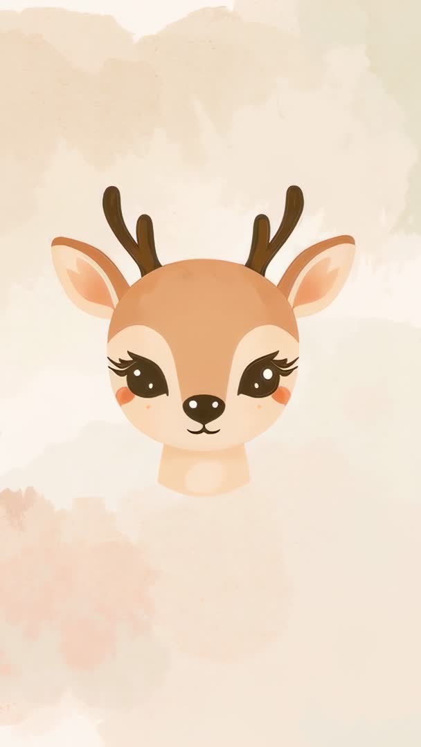 AI Generated Video. Vertical looping video showing cute deer head bobbing gently while zooming on soft pastel watercolor wash background. Featuring small antlers, rosy cheeks, long lashes, and centered composition for easy overlay. Working as charming nursery wallpaper, phone lock screen, social media story background, Instagram reel loop, or element for children's apps and animated stickers. Supporting seamless loop playback and vertical 9:16 format for mobile-first projects. Recommending short loop length (4–12 seconds) and safe areas at top and bottom for adding text, logos, or call-to-action. Matching calm, warm color palette for baby shower invites, greeting cards, holiday graphics, web banners, and playful branding.