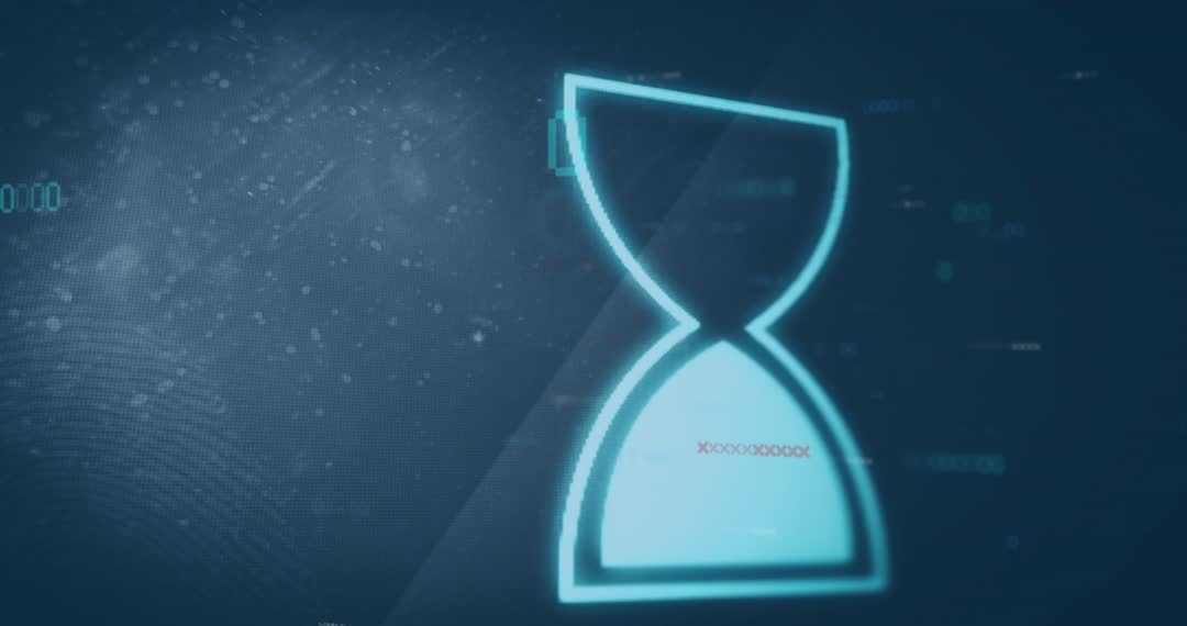 Looping cyan hourglass rotating into split triangular halves over HUD backdrop showing numeric countdown and flickering data. Neon glow and particle dust adding cinematic depth while fingerprint matrix and subtle glitches suggesting cybersecurity and authentication themes. Motion graphics designed for seamless looping, useful for timer overlays, transitional stingers, app intros, broadcast countdowns, website hero backgrounds, or streaming countdowns. Color palette featuring cyan and deep blue fitting tech and sci-fi projects. Delivery options recommending loop-ready MP4 or GIF, compatible with overlaying text or logo for branding or title sequences.
