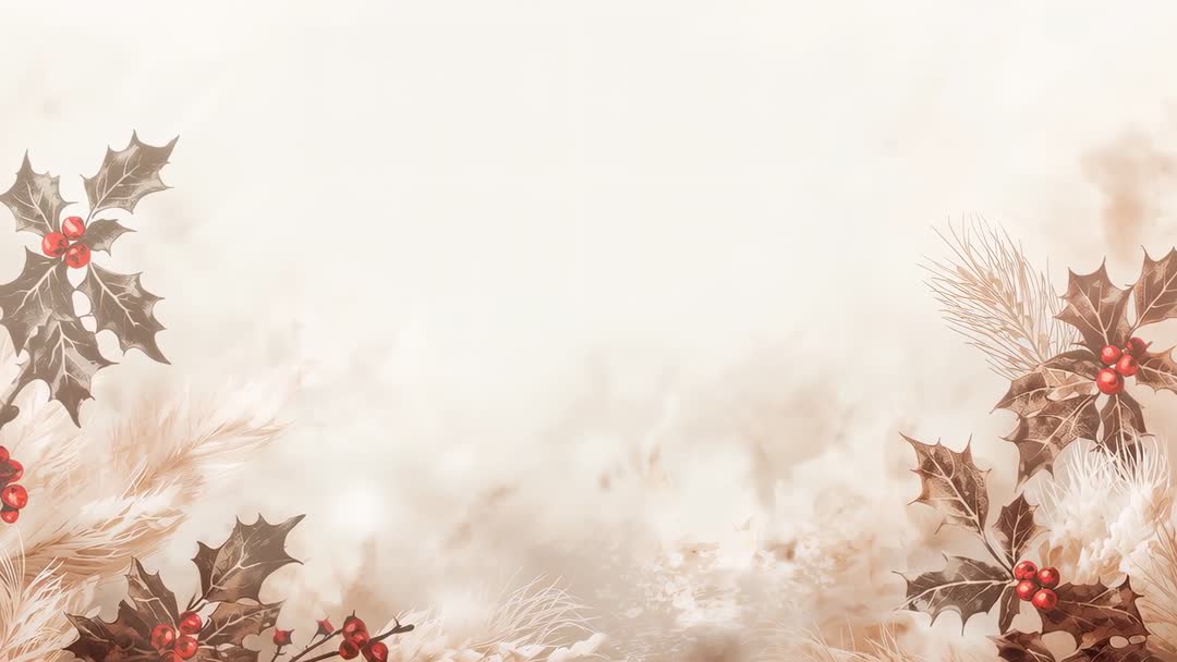 AI Generated Video. Looping holiday clip showcasing central blank cream-toned area pulsing with gentle light while holly clusters with red berries and dried grasses framing left and right edges. Soft bokeh and subtle film grain adding warm vintage feel. Composition providing generous negative space for text, logo and animated overlays. Seamless loop working well for social media stories, Instagram reels, Facebook covers, YouTube intros, website hero banners, email headers, digital greeting cards, seasonal ads, in-store displays and holiday slideshows. Color palette featuring warm cream, muted brown-greens and pops of red for festive accent. Compatibility with slow crossfade, caption overlays, text reveal animations and product mockups. Delivering calm elegant holiday mood suitable for brand campaigns, greeting messages, seasonal promotions and video transitions.