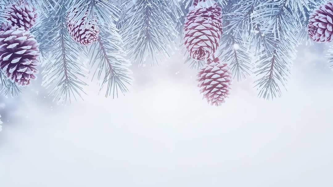 AI Generated Video. Loop starting with frosted pine boughs hanging from top edge, pinecones gently shifting along branch line while snowflakes slowly drifting downward. Soft bokeh and pale gradient center providing open negative space for text, logo, or overlay. Color palette featuring cool blue-gray tones with subtle pink tint on cones, creating calm festive mood. Suitable for holiday banners, social media headers, greeting card animations, website hero backgrounds, digital signage, broadcast lower thirds, virtual event backdrops. Recommended formats MP4 or WebM, seamless looping, duration 6-12 seconds, 24-30 fps, higher resolutions for 4K delivery. Suggested usage tips: place text or logo in center with contrasting color, add subtle vignette or glow, layer gentle music or sleigh bell sound for seasonal projects.