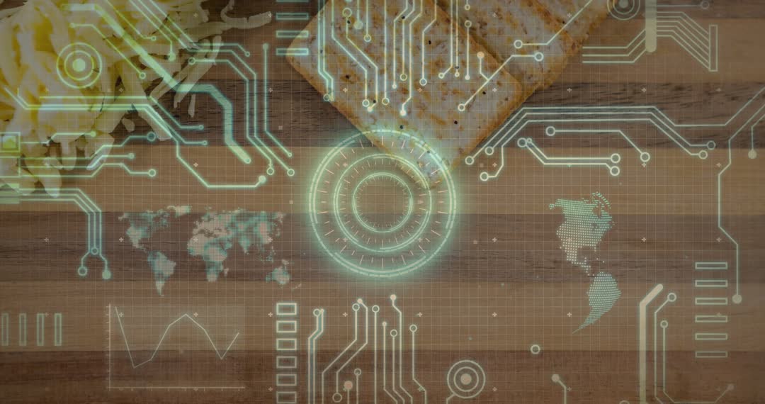 - Looping holographic HUD mapping data over wooden tabletop with neon circuitry overlay