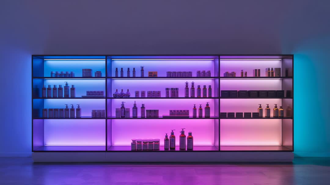 - Looping LED-lit retail shelving cycling neon gradient lighting over product display