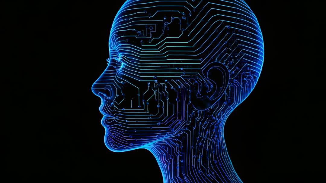 - Looping Neon-Blue AI Head Pulsing Circuit Traces on Black Canvas for Tech Video