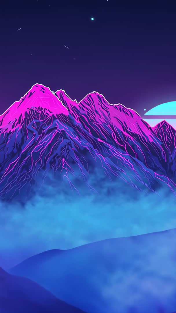 - Looping Neon Mountain Mist with Magenta Peaks and Cyan Sun Vertical Parallax Nightscape