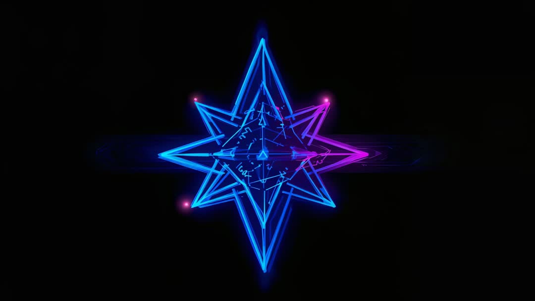 AI Generated Image. Video loop showing neon octagonal star pulsing in black void with compass lines and glowing nodes. Bright blue and magenta gradients accenting geometric edges, glitchy central circuitry adding digital texture. Serving futuristic tech intros, HUD overlays, music visualizers, electronic music event promos, website hero animations, app backgrounds, sci-fi trailers. Looping seamless motion allowing continuous playback for displays, VJ sets, projection mapping. Color palette offering easy recoloring for brand matching. Delivering high-resolution loop compatible with 4K displays and motion graphics workflows, working well as background layer for title sequences, transitions, generative art installations.