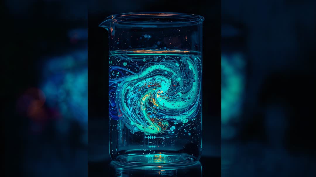 AI Generated Image. Looping short video showcasing neon cyan vortex swirling inside transparent beaker, bubbles rising and catching soft bokeh highlights. Close-up composition emphasizing glass reflections, turbulent flow textures, and luminous teal-blue palette. Footage working well for science and technology promos, laboratory branding, educational explainer sequences, music visualizers, and social media loops. Editors finding easy integration thanks to clean subject isolation, dark vignette, and smooth looping motion. Recommended uses including motion graphics overlays, title intros, website hero banners, event visuals, and product demo backgrounds; consider applying slow-motion retiming or bold color grade for dramatic effect.
