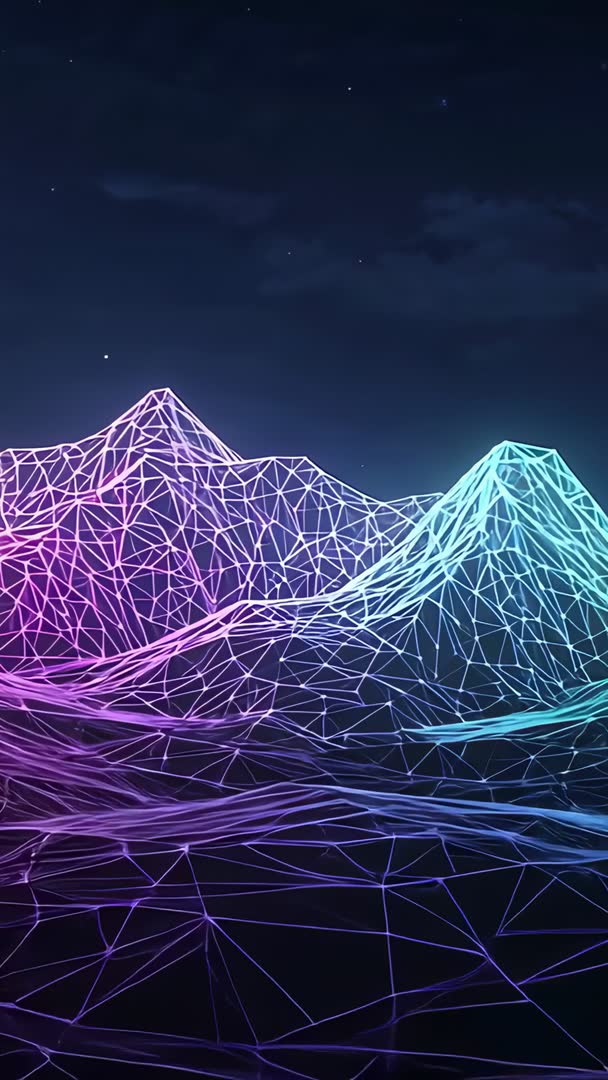 AI Generated Video. Showing sweeping light traveling across neon wireframe mountain range, creating pulsing purple and cyan glows against starry night sky. Featuring seamless loop animation in vertical 9:16 aspect ratio, suited for mobile backgrounds, social media stories, app intros, music visualizers, VJ loops, event backdrops and promotional content. Conveying futuristic synthwave mood with high-contrast glowing lines and deep navy backdrop. Suggesting usage ideas: placing brand logo or caption overlay, syncing loop with electronic soundtrack, using as intro or interstitial clip, applying color grade to match brand palette. Recommending export at 4K vertical for crisp display and loop lengths between 10 and 30 seconds depending on project.