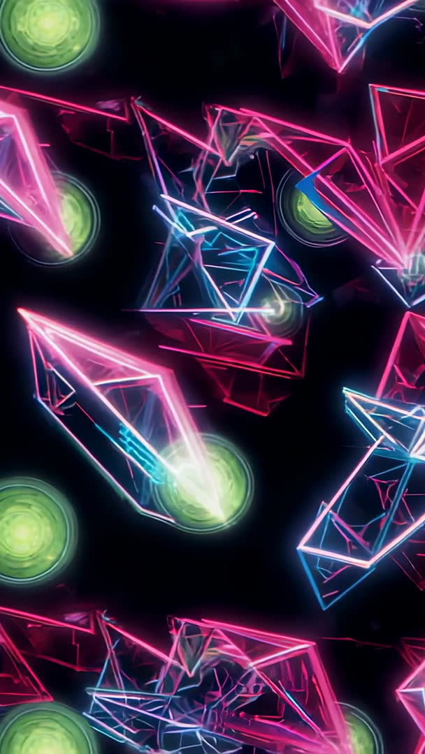 AI Generated Image. Featuring neon pink and blue wireframe prisms drifting and rotating through black void while glowing lime orbs punctuate composition. Looping vertical video targeting portrait displays and social platforms, creating high-energy, vibrant sci-fi atmosphere. Suiting use in music visuals, VJ loops, title sequences, mobile ads, app intros, livestream overlays, and digital signage. Enhancing projects by adding dynamic geometric motion, neon color pops, and seamless looping for continuous playback. Suggest using blend modes and color grading to match brand palette, syncing motion to audio beats, and cropping for alternative aspect ratios. Delivering polished background for tech presentations, product reveals, creative social content, and immersive multimedia installations.