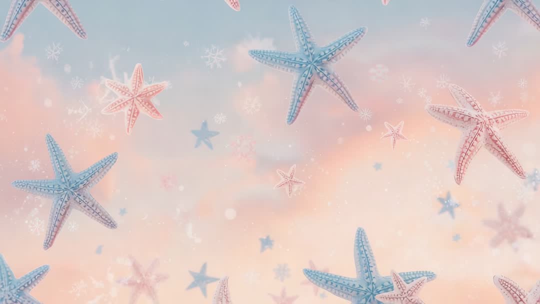 AI Generated Video. Looping pastel starfish drifting over peach-blue gradient, creating calming motion and gentle parallax. Soft bokeh and tiny snowflake-like sparkles adding dreamlike texture and subtle depth. Ideal for relaxing video loops, social media backgrounds, website hero headers, mobile wallpapers, meditation and spa promotions. Working well for seasonal summer campaigns, beach-themed promotions, kids content, greeting card animations, and animated packaging. Providing seamless loop and parallax layers for endless playback and smooth transitions. Color palette and speed customizable for brand matching. Delivering ready-to-use MP4 loop at 1920x1080 or 4K; exportable to GIF for lightweight use. Allowing overlay of text or logo with safe margin in upper or lower thirds. Licensing options suitable for royalty-free stock libraries and commercial projects.